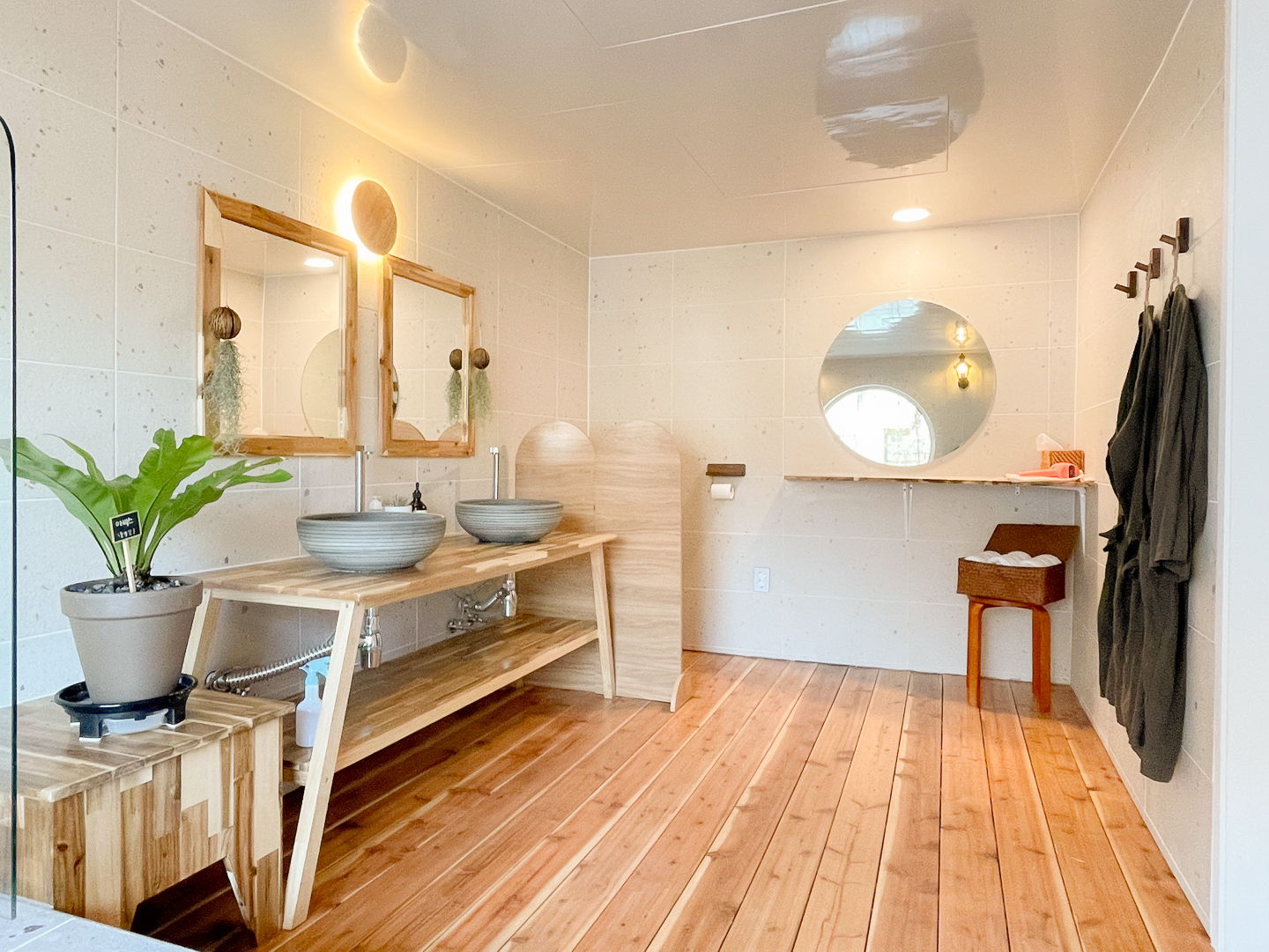 갑갑하지 않게 탁 트인 욕실 공간에는 워시드 린넨 샤워가운과 고급 어메니티까지 준비되어 있어 머무는 이를 위한 세심한 배려가 느껴집니다.