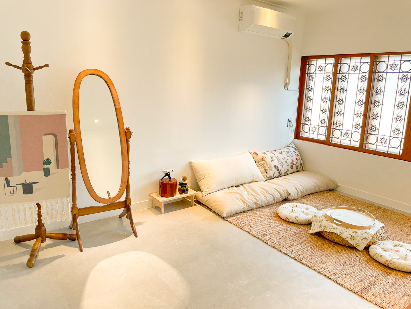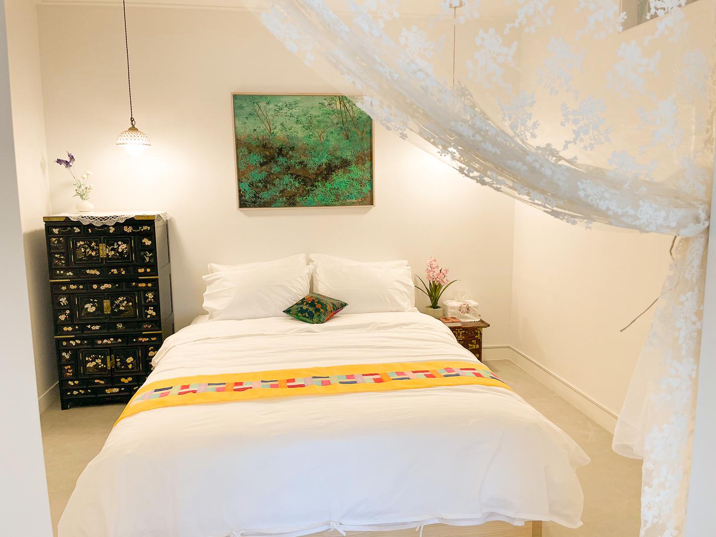 한옥 특유의 단아한 느낌을 살린 휴휴가의 침실 공간에는 포근한 시몬스 퀸사이즈 베드가 있어 순식간에 숙면에 빠져듭니다.
