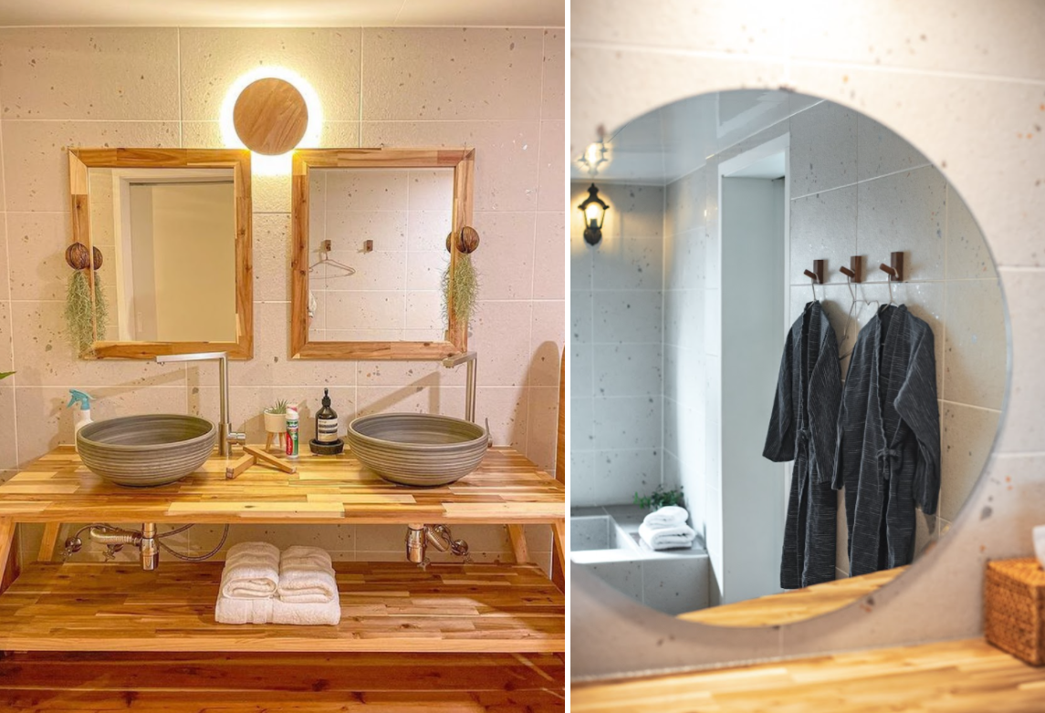 5성급 호텔 못지않게 마련된 깨끗하고 넉넉한 호텔식 터키 순면 샤워타월과 욕실에서까지 자연을 느끼게 만들어주는 나무 칫솔세트와 뱀부 슬리퍼까지.